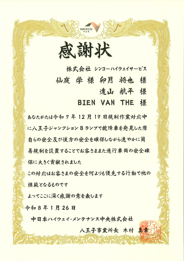 通行車両及び故障車両の安全確保に大きく貢献したとして感謝状を頂戴しました。