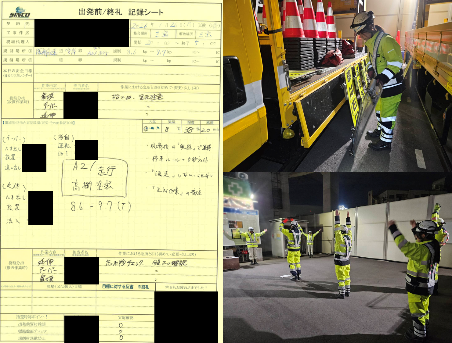 移動中および現場までの回送時において、「巻き込みヨシ」「歩行者ヨシ」「ETC(挿入)ヨシ」など