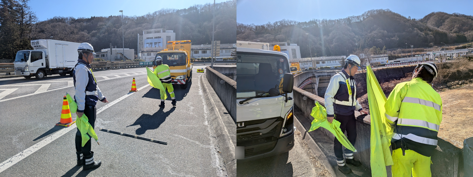 路肩規制と言えども安全対策に抜けはなく 飛散対策 立哨配置 もしっかりできていた。