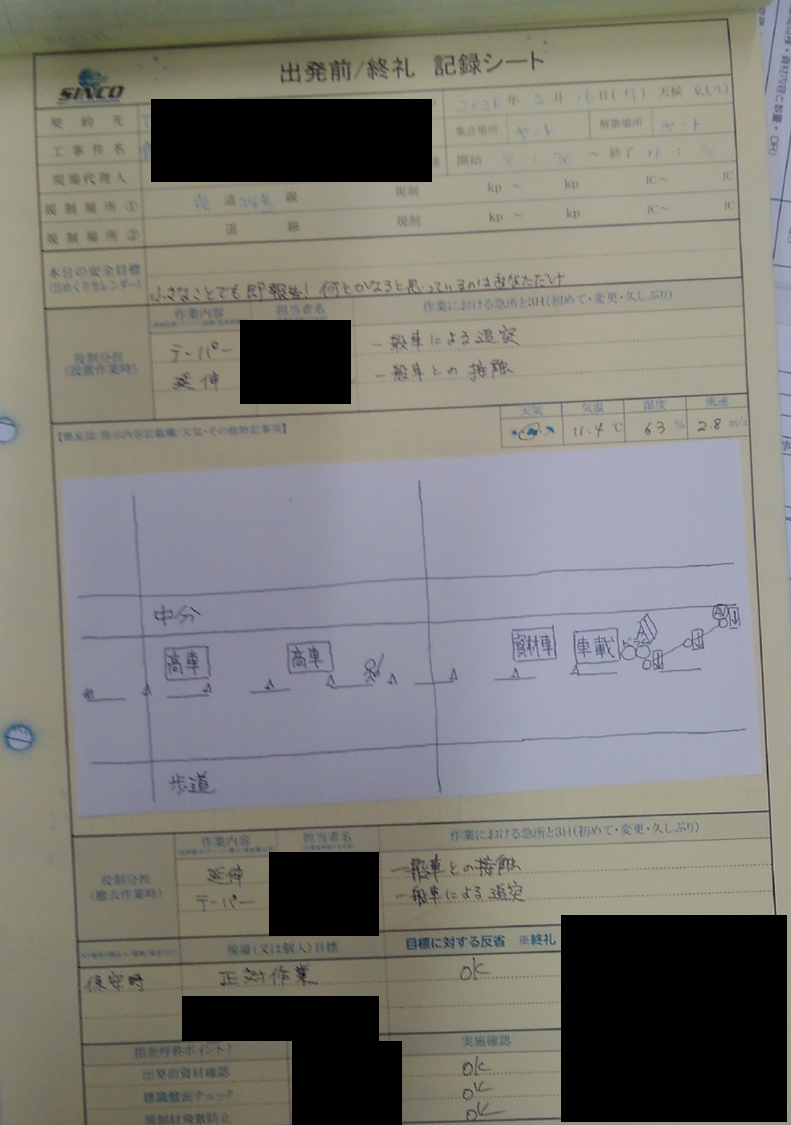 所感 【本日の重点項目】 ・歩道進入前に一時停止 ➤当日のDRチェックに於いても一旦停止は守られていた 全体的に手順や配置もしっかりと指示出来ており、大きなミスは無し:帰社時フィードバック ・指摘事項 ➤テーパー部設置時輪止めを通行帯側に配置。 共用車線側での危険作業+飛散の危険性が理解していなかったのが懸念 後程の聞き取りで本人はその意味を理解し普段は出来ているという事だったが、 本日は見られているという意識から緊張していたとの弁 基本作業は普段通り作業できる様指示。 ➤全体的に目線の正対が危うい時がありここを指導。