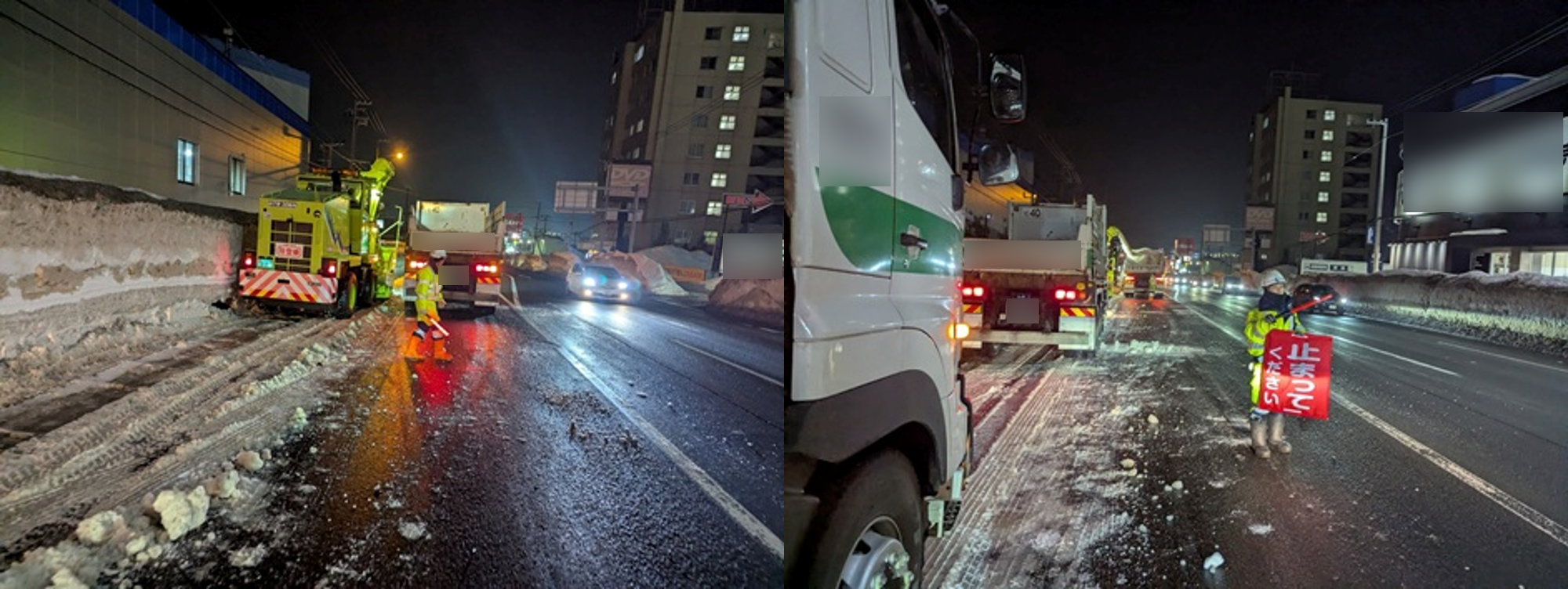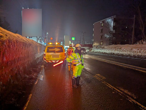 現場は市内国道の堆積された雪の除雪に伴う作業で当社職員にて先方の車両を使用し現地まで移動。