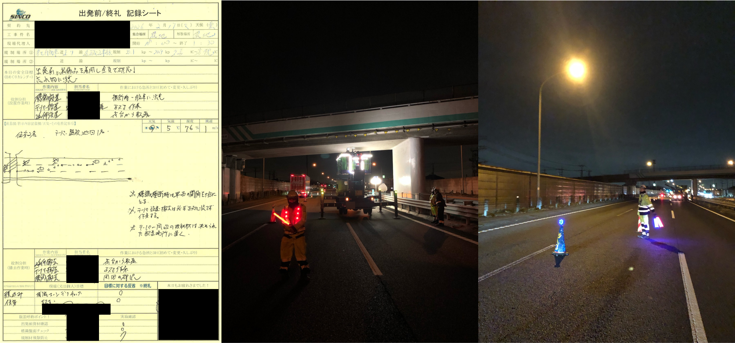 監視員・発炎筒設置・矢板とコーンの設定・標識車の移動と