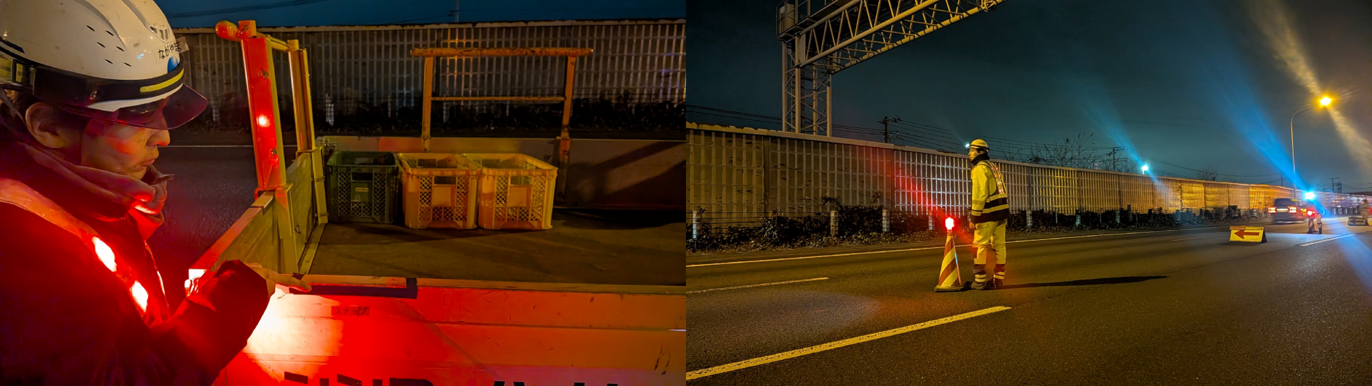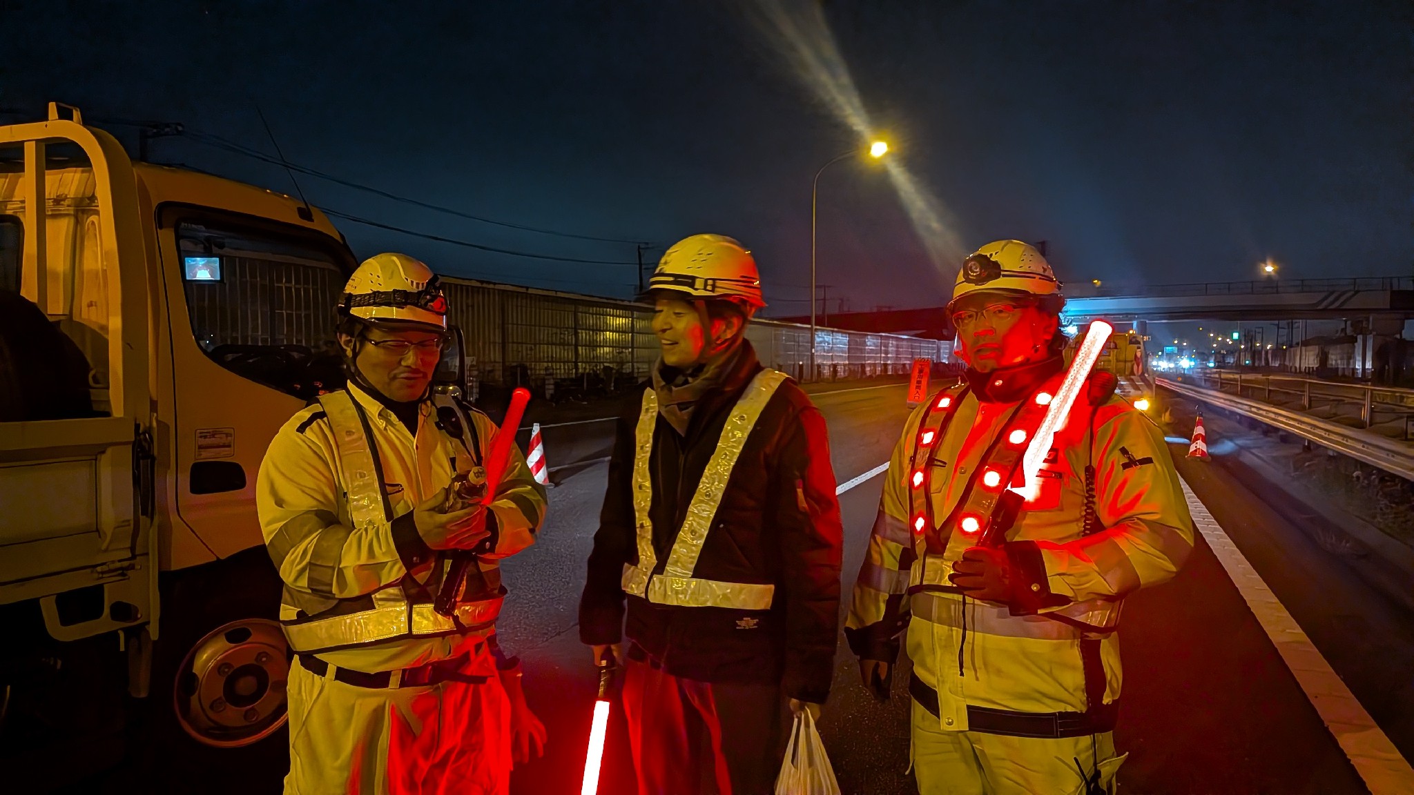 事前に追越規制から作業を始め、交通量が落ち着き始める21:30より二車締めを開始