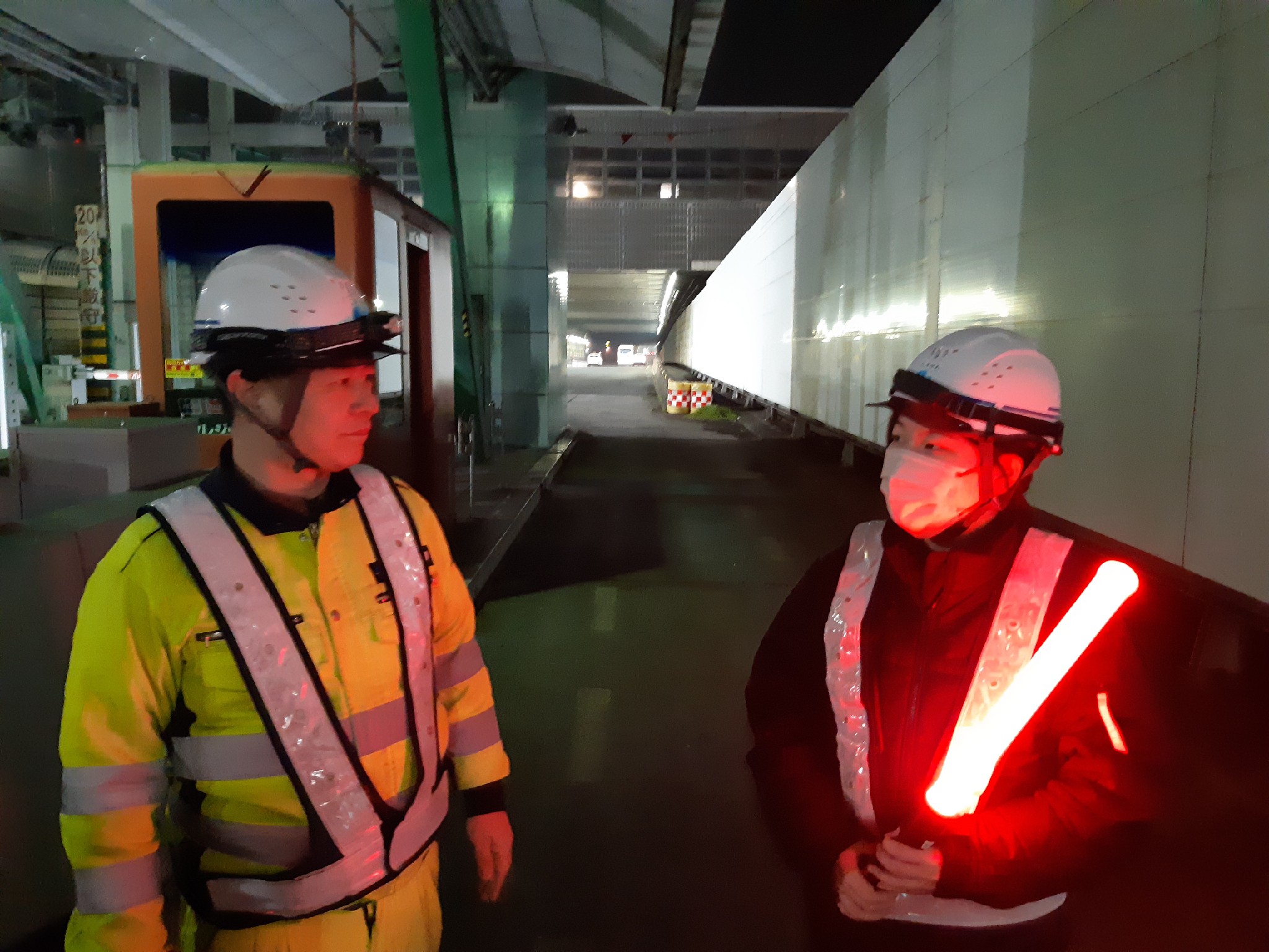 昼現場とは異なり、夜現場は視認性が悪く、本線を走る一般車両の速度も速く感じました。
