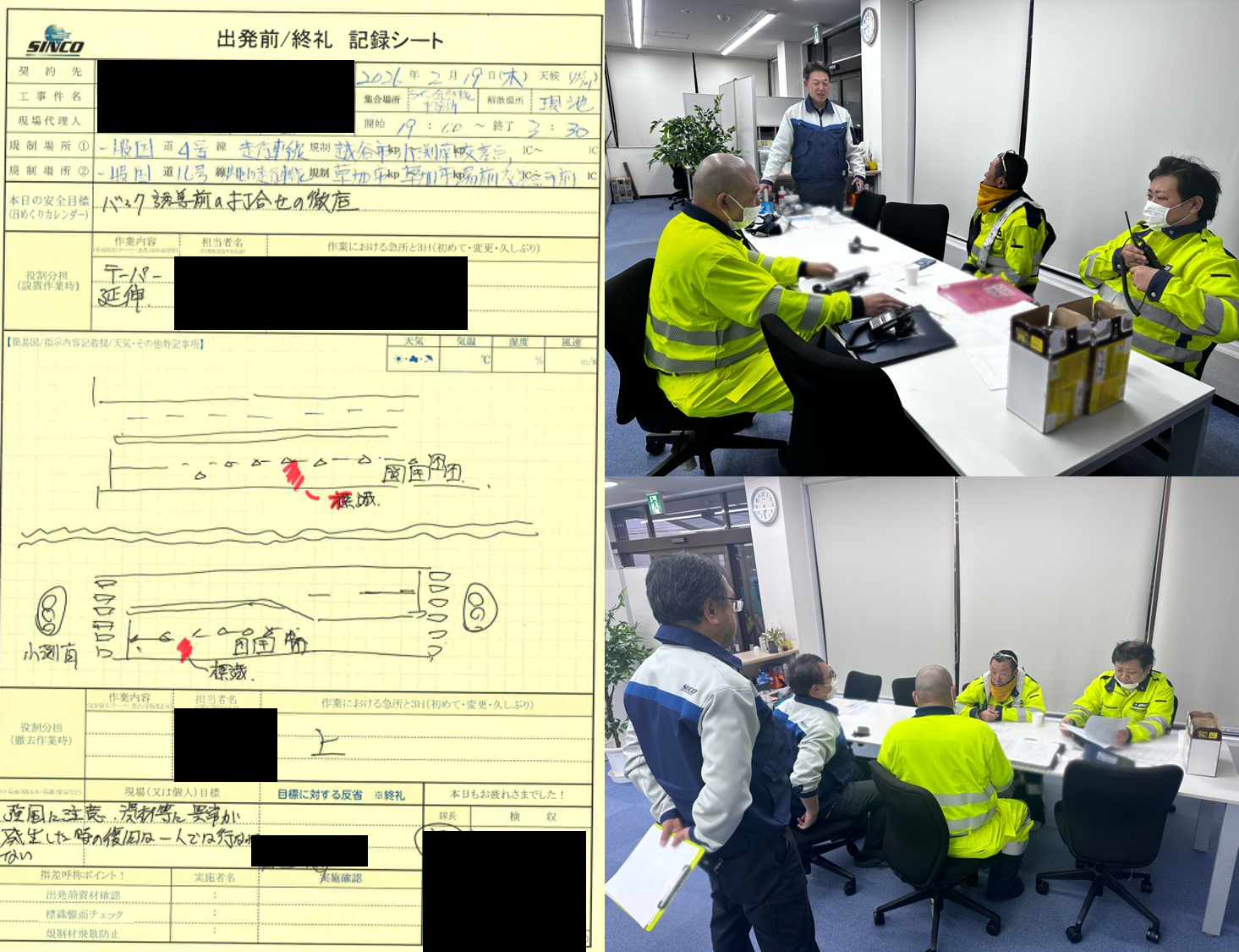 ・出発からお客様との朝礼、規制設置時の各自役割、設置の手順について