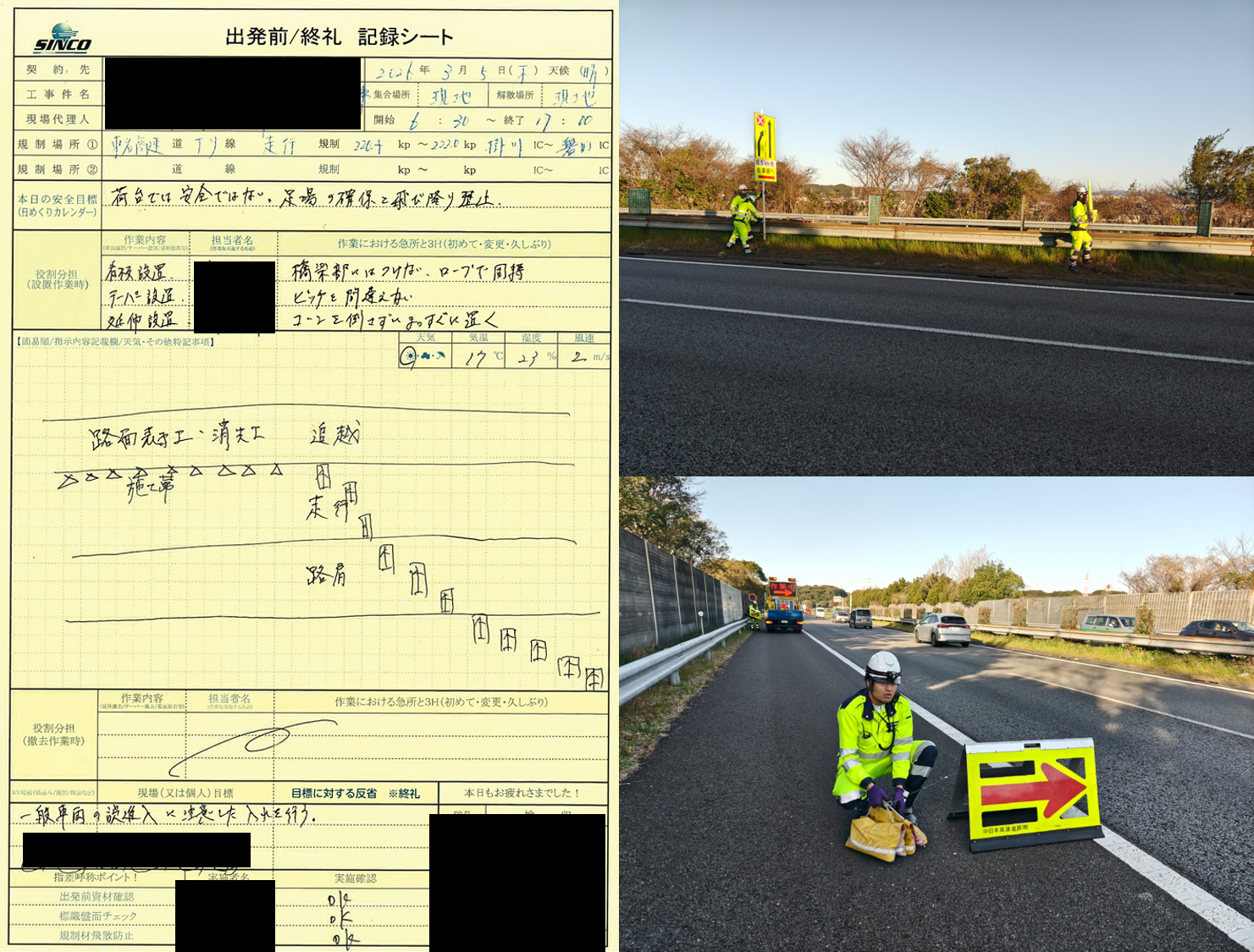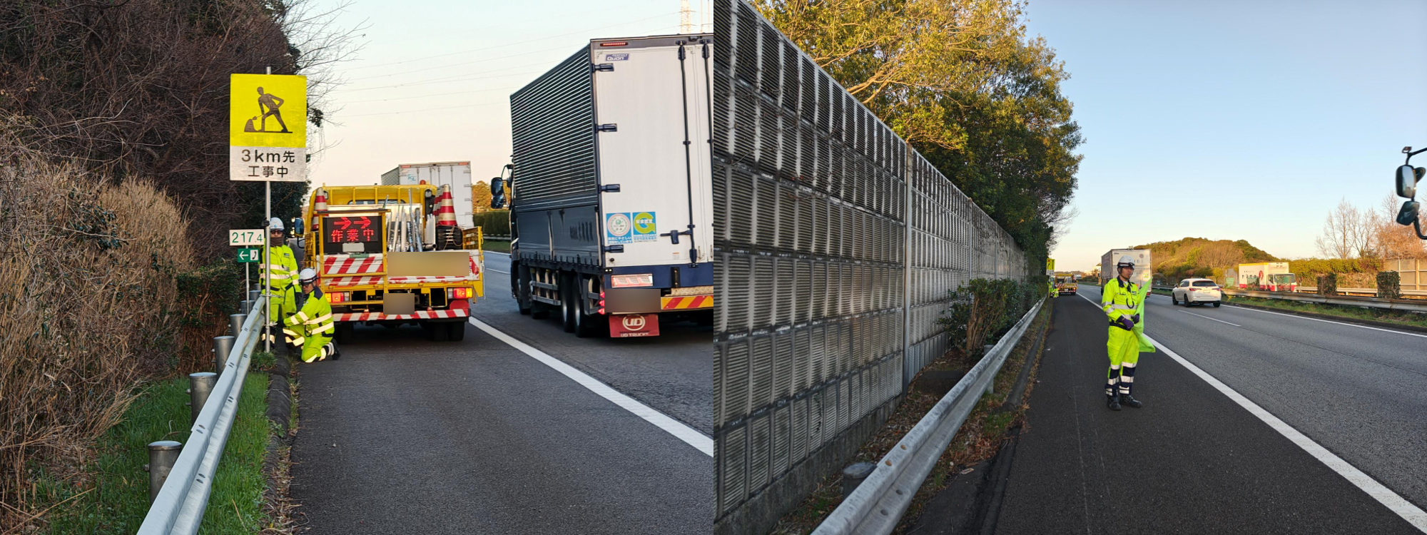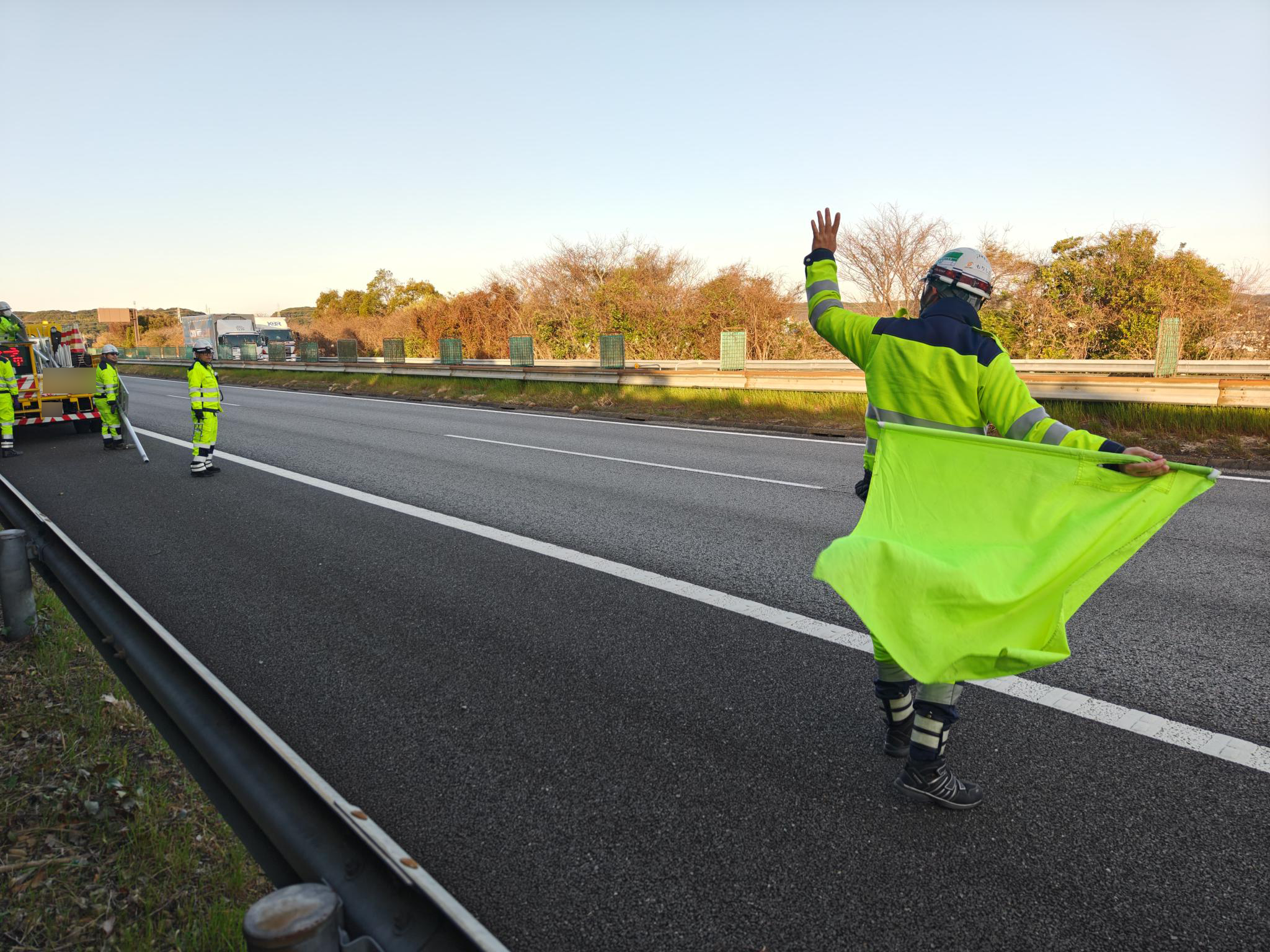 ブリーフィング内容 ①規制図を参照し、乗車車両の確認・規制手順・各自の役割・保安箇所の周知 ②KY・各作業箇所における急所と対策について説明 ⓷移動経路及び反転路の危険箇所の確認 ④久しぶりの現場稼働になるため各車両の資材確認の徹底 概ね理解できていた。所感 本日の規制箇所は東名高速道路下り線の袋井IC~磐田IC間の走行車線規制で見通しは良いですが ゆるい上り坂がある区間での規制になります。 ◆良好点 ・隊長の交通誘導2級資格者証を確認 ・発炎筒の転がり防止、消火器、発炎筒回収缶の搭載、 消火用水(ポリタンク)のテーパー部1枚目に設置が行えており良好でした。 ・標識設置の際に車両から運転手が降車する場面では輪留め設置が徹底で来ており良好でした。 ・要所要所で車載車の荷台に上る場面においても昇降用の梯子を設置し昇降が行えていた。 また、昇降用の梯子の設置・撤去もスムーズに行われており良かったと思います。 ・標識の盤面確認の際も指差呼称での確認、 車載車の運転手・助手席双方に指差呼称での確認後の無線機にて盤面を読み上げ確認を行い Wチェックが行えており良好でした。 ・規制内に設置されている資機材の固縛・固定を確認 ・発電機の盗難防止対策のチェーン確認 【牛山所長 コメント】 営業所での送り出し・資材積み込み状況・BFのみの参加となりましたがパトロールを実施 不慣れな隊長ではありますが、古株の隊員と安全委員両名で バックアップを行いながら当日をむかえました。 前日の勤務終了後から書類や説明用の資料、ホワイトボードの事前記入等、 準備をしっかりしており非常に頼もしい姿が見れました。 BF時に指示抜けや隊長が気付けていない箇所を 古株の隊員と安全委員両名が指摘とフォローを行っており、こちらも〇 静岡営業所では車線規制が他営業所に比べて少なく大変貴重な経験が皆出来たように感じます。 帰社後に車線経験の少ない隊員さんに声掛けした際にも疲れましたが楽しかったです。 との声が聞けてしっかり現場でもみんながフォローしてくれている事と 楽しかったという言葉を聞けた事は非常にうれしく思います。 営業所設立から3年5ヵ月が経過し、今が一番大事な時期だと捉えます。 基本を大事に出来る営業所を目指して引き続き教育を実施してまいります。 【松木係長 コメント】 集合場所での朝礼から規制設置完了後まで立ち合い設置パトロールを実施致しました。 集合場所での朝礼の際は、隊長がお客様に規制内に流入する車両台数や作業内容、 今後の予定等確認し、打ち合わせが行えている場面が見れたので 非常に頼もしく感じ良かったと思います。 打ち合わせ場所から標識設置場所までの移動の際は車載車の助手席に同乗し、 運転手ベテラン隊員・助手席の新人隊員による指差呼称やコメンタリー運転が 行えている場面や坪井隊員が新人隊員の狩野隊員に対して 適時「次こういう動きだからこうしてね」と優しく指示をしている場面や車載車の荷台に乗った際、 発電機をかける場面でなかなか発電機を掛けることが出来なかった場面でも 焦らせず、急かさず、落ち着いて、的確に優しく教えている場面を見ることが 出来たので新人隊員さんに対するフォローがよく行えており非常に良かったと思います。 規制設置では各作業での監視員の配置、降車時の4点ルーティンと5秒ウエイトルールの実施、 標識設置時の盤面確認も指差呼称での確認と無線にて 盤面の内容を読み上げてWチェック、車線横断時の確実に途切れるタイミングを待ち、 横断できていたことや発炎筒の転がり防止や資機材の飛散対策等も 確実に行えており基本ルールをチーム全体で順守して作業が行えており良かったと思います。 指摘事項としては集合場所から出発する直前に私が車内に乗車した際、 DRの電源が落ちていた(出発前点検時は動作確認。 出発時は動作していても走行中に落ちてしまうこともあるので 定期的に確認するよう指導致しました。 また、テーパー設置前の準備をしている際、 監視員として配置されていた隊員が準備を手伝いそうになろうとするシーンがあったので 監視員は監視に専念し、危険が予測される際は周囲に警笛等で危険を知らせる、 安全な場所に退避するよう指導を行いました。 新人隊長ですが本日メンバー構成もベテラン隊員、応援隊員、 新人隊員という構成の中での現場隊長でした。 ベテラン隊員さんから学びつつ新人隊員さんへの指示を出したり 指導・教育するという環境で仕事が出来ていたので 今後の成長に繋がったと思います。隊長自身が作業を行ったり、 動いてしまったりする場面もありましたので現場全体を見る視野を広く持つ力や 隊員さんに指示する、任せるといった面についても 今後は教育を行い隊長として成長し会社に貢献していただできるように 今後もフォローを行って参ります。