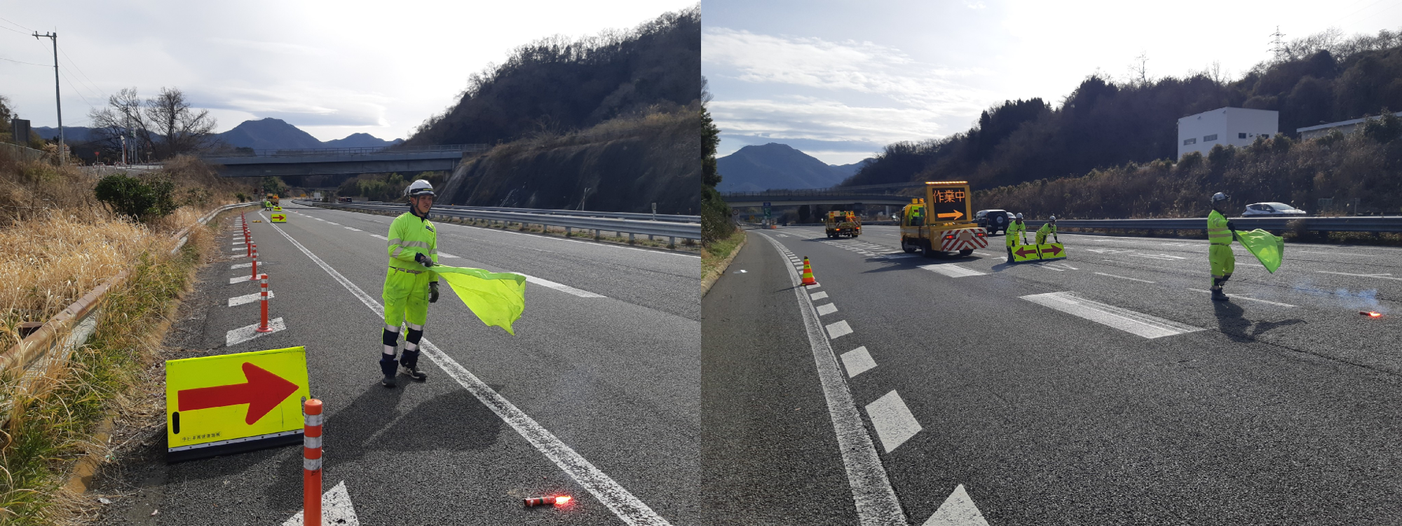 2島の左ルート閉鎖部で標識車を使用しているため、