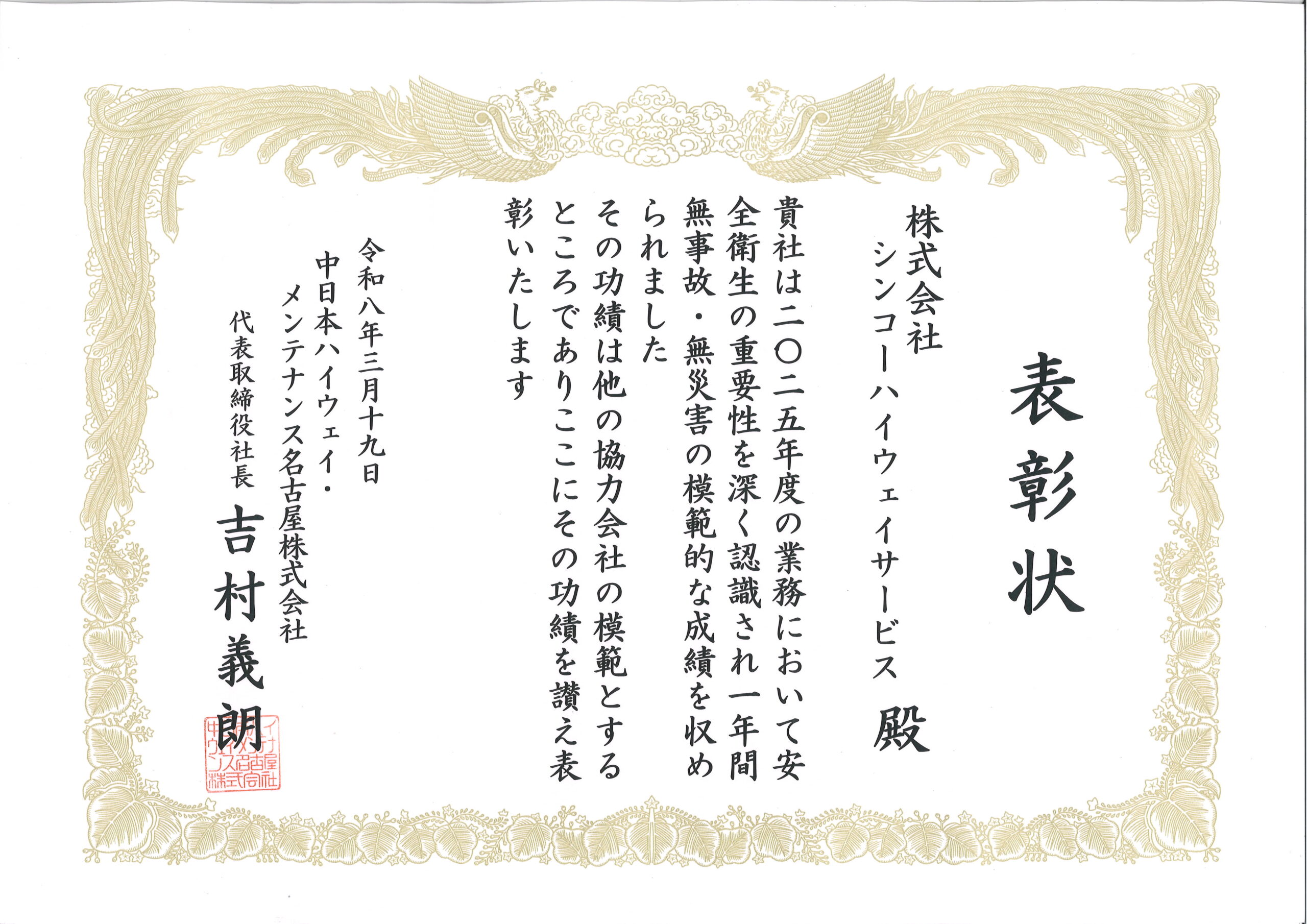 中日本ハイウェイ・メンテナンス名古屋株式会社様より表彰状を頂戴しました