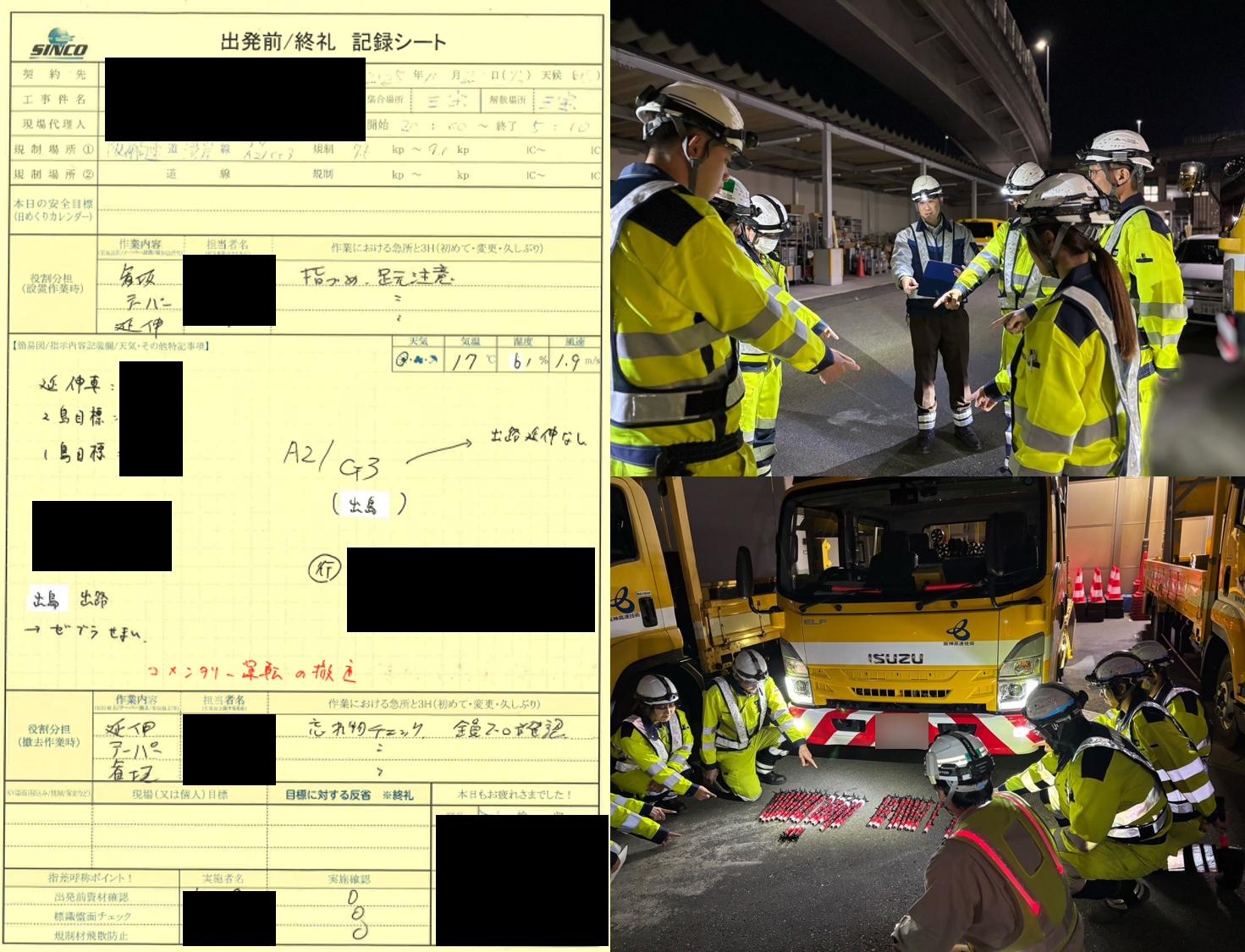 〇資材準備時、職員が使用する標識車の傷等がないかライトを点灯しながら入念に確認していたこと