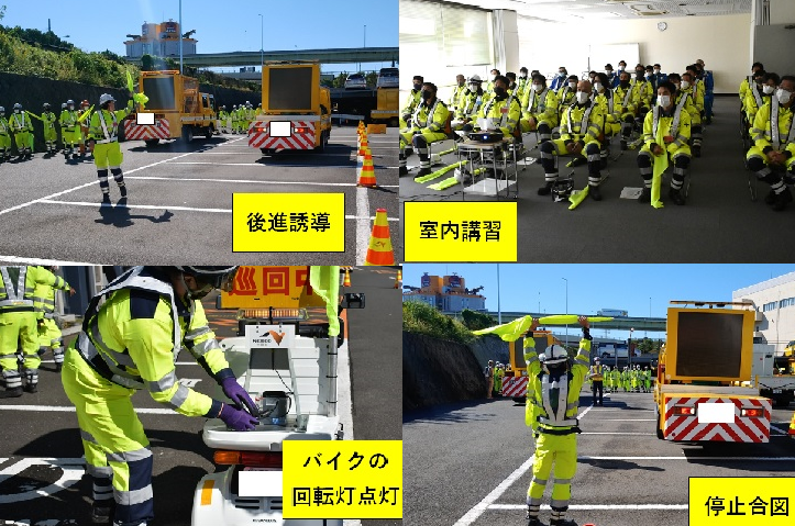2021年10月 2021年度東名集中工事(首都圏)保安員講習会(中日本支社) ■指導・教育内容 〇屋外訓練 〇流入訓練 〇流出訓練 〇後進誘導訓練 〇バイク訓練 〇室内講習■所感 2021年度東名集中工事(首都圏)保安員講習会に参加しました。 初日でしたが各営業所より多数の参加者が集まり、全体で100名を超える規模となりました。 今回の講習の中で苦手な部分や講師より指摘された部分があると思いますが、 その部分を改善することでヒヤリハットも少なくなり現場での安全性も向上します。 指摘された部分を改善できるように、各営業所の内勤者で教育を行っていきます。