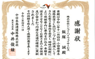 中日本高速道路株式会社様より表彰状を頂戴しました